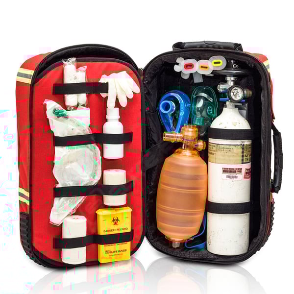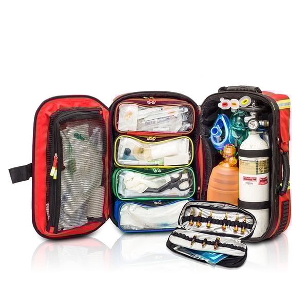 Advanced Life Support (SVA) Notfall-Aktentasche . Seine Öffnung mit einer herunterklappbaren Klappe ermöglicht den Zugang zu den notwendigen Instrumenten für Maßnahmen in verschiedenen Notfallszenarien, wobei die Räume so angeordnet sind, dass sie schnell identifiziert und somit herausgezogen werden können.