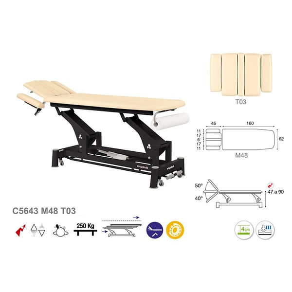 Innovative elektrische Trage mit Ecopostural-Technik, bestehend aus drei Körpern und einem elektrischen Hebesystem . Es besteht aus einer Stahlkonstruktion aus Pleueln mit Lagern und einziehbaren Rädern , die die seitliche Bewegung erleichtern. Es verfügt über eine Schaumstofffüllung in verschiedenen Stärken und eine Polsterung der Klasse M2. Darüber hinaus verfügt es über einen neigbaren Kopf mit Gesichtskappe , der sowohl dem Arzt als auch dem Patienten mehr Komfort bietet.
