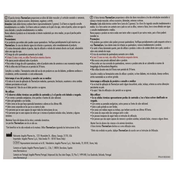 Jede Thermozelle enthält Eisen (ca. 2 Gramm). Wenn Eisen verschluckt wird, konsultieren Sie sofort Ihren Arzt. Wenn Eisen mit Ihrer Haut oder Ihren Augen in Kontakt kommt, entfernen Sie das Pflaster, spülen Sie die betroffene Stelle mit Wasser ab und konsultieren Sie sofort Ihren Arzt. Erhitzen Sie das Produkt niemals in der Mikrowelle oder versuchen Sie es auf andere Weise erneut zu erhitzen, da das Pflaster Feuer fangen könnte. Produkte, die Wärme abgeben, können Verbrennungen verursachen. Überprüfen Sie Ihre Haut regelmäßig, während Sie ThermaCare verwenden. Wenn Sie Anzeichen einer Reizung oder eines Brennens feststellen, entfernen Sie das Produkt sofort. • Wenn sich das Pflaster zu heiß anfühlt, beenden Sie die Verwendung oder entfernen Sie es von direktem Kontakt mit der Haut und legen Sie es auf eine Kleidungsschicht. • Um Ihre Hitzeempfindlichkeit zu überprüfen, sollte die erste Anwendung des Pflasters tagsüber erfolgen, während Sie wach sind. • Das Risiko, Verbrennungen zu erleiden, steigt mit zunehmendem Alter. Wenn Sie 55 Jahre oder älter sind, verwenden Sie ThermaCare nicht im Schlaf. Achten Sie beim Auftragen von ThermaCare auf Ihr Handgelenk darauf, dass die Wärmezellen nicht überlappen. Benutzen Sie es innerhalb von 24 Stunden nicht länger als 8 Stunden. Beenden Sie die Anwendung des Produkts und konsultieren Sie Ihren Arzt: Wenn Sie Beschwerden, Brennen, Schwellungen, Ausschlag oder andere anhaltende Hautveränderungen im ThermaCare-Anwendungsbereich bemerken. Wenn die Schmerzen nach 7-tägiger Anwendung anhalten oder sich verschlimmern. Außerhalb der Reichweite von Kindern und Haustieren aufbewahren. Nicht verwenden, wenn Sie feststellen, dass die Thermozellen ihren Inhalt verloren haben und/oder das Pflaster beschädigt oder zerrissen ist. Zum einmaligen Gebrauch. Enthält keine Medikamente