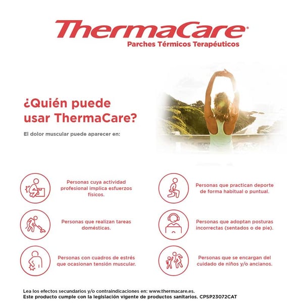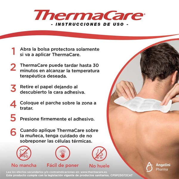 - EINFACH ZU VERWENDEN. Die Thermopflaster erwärmen sich wenige Minuten nach dem Öffnen der Verpackung von selbst. Platzieren Sie das Pflaster auf der zu behandelnden Stelle. Drücken Sie den Kleber fest an. Achten Sie beim Auftragen von ThermaCare auf Ihr Handgelenk darauf, dass die Wärmezellen nicht überlappen. Hinterlässt keine Klebereste. Es müssen keine Patches aktiviert werden