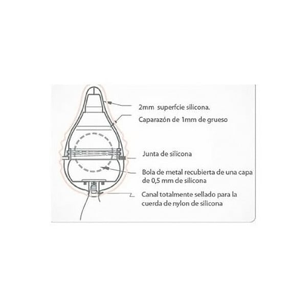 Besondere Merkmale: 1 mm dicke Schale. 2 mm Silikonoberfläche. 1 mm Verstärkung. Silikondichtung. Metallkugel mit 0,5 mm dicker Beschichtung. Vollständig abgedichteter Kanal für das Silikon-Nylonkabel.