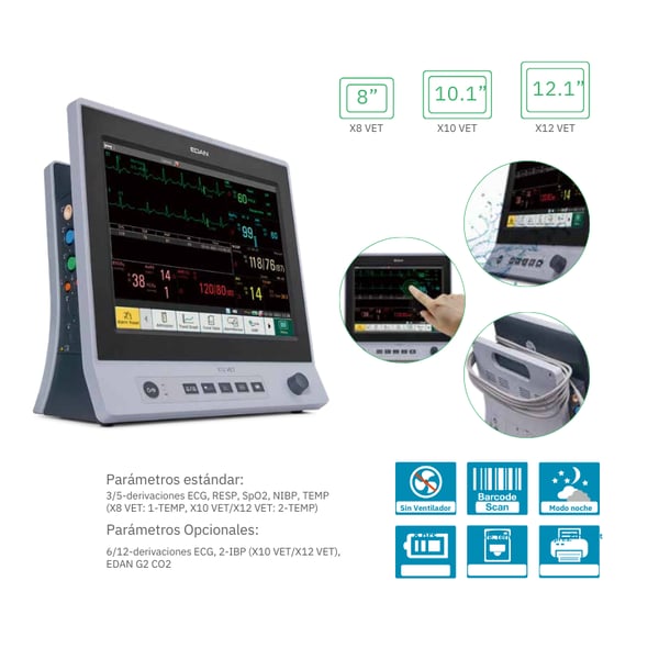 3/5-Kanal-EKG, RESP, SpO2, NIBP, TEMP (X8 VET: 1-TEMP, X10 VET/X12 VET: 2-TEMP)