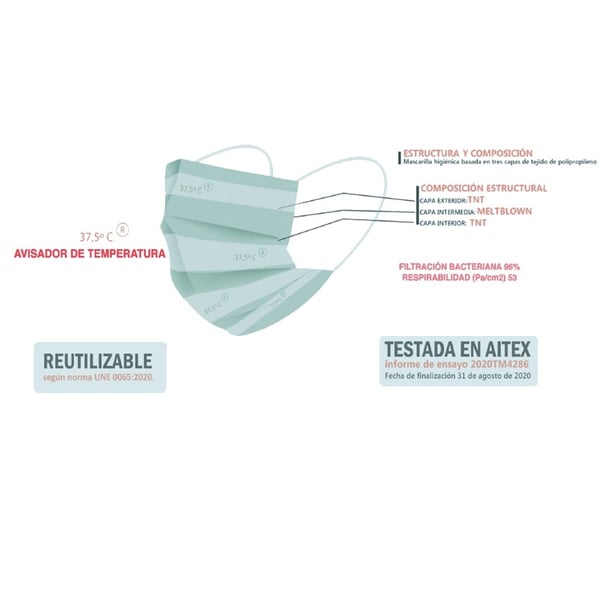 - Wiederverwendbare Hygienemaske gemäß der Norm UNE0065: 2020. Getestet bei Aitex mit dem Testbericht Nr. 2020TM4286 mit Fertigstellungstermin 31. August 2020.