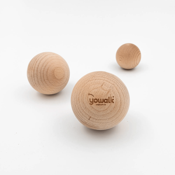 Wooden Bubbles™ : Holzbälle zur Massage und Dehnung der Füße. Sie ermöglichen punktuellen Druck, regen die Durchblutung an, lösen Muskelverspannungen und fördern die Entspannung. Sie sind besonders wirksam bei der Behandlung von Triggerpunkten im Fuß.