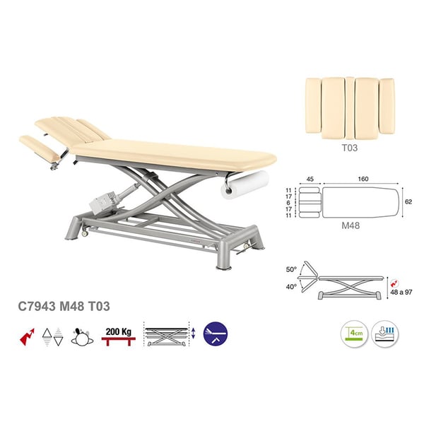 Elektrische Trage mit zwei Säulen, zwei Körpern und vertikaler Höhe mit einem bis zu 90° neigbaren Kopf, inklusive Rollenhalter. Es hat ein einfaches, modernes und funktionales Design. Ein weiterer großer Vorteil des Tisches ist seine Vielseitigkeit, da er sich ideal für zahlreiche Bereiche eignet: Physiotherapie, Osteopathie, Allgemeinmedizin, Ästhetik, Tätowierungen. Eine perfekte Lösung für jeden Gesundheits- und Ästhetikprofi.